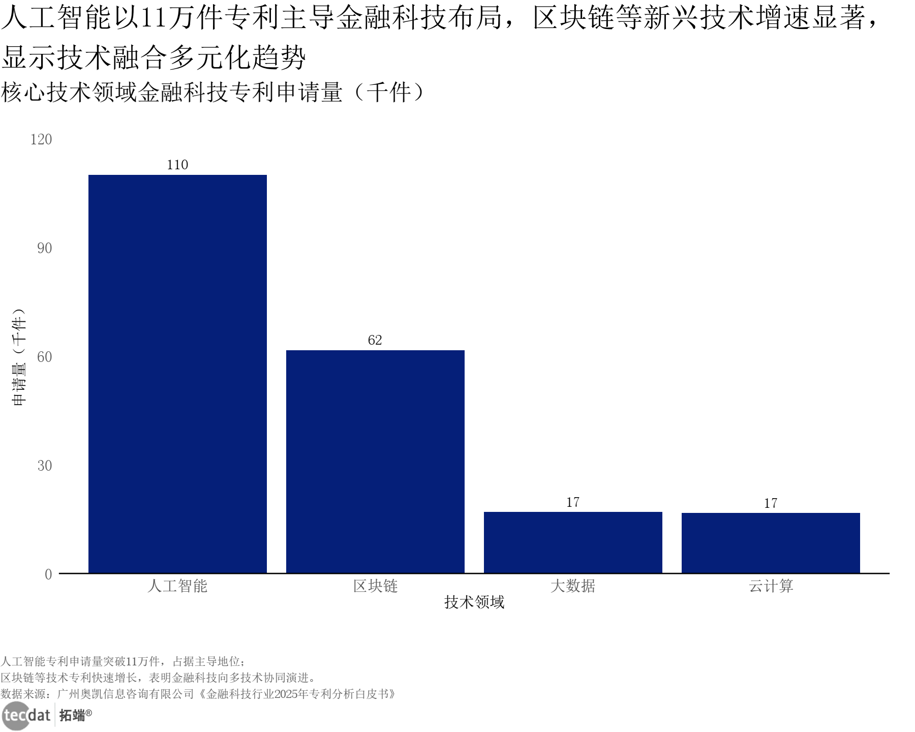核心技术领域金融科技专利申请量条形图表12数据及PDF模板已分享到会员群 3秒解读:人工智能以11万件专利主导布局,区块链61618件、大数据16915件、云计算16609件紧随其后,技术融合趋势明显。 对应人群行动建议:技术研发团队可聚焦AI与区块链、隐私计算的交叉领域;专利服务商可推出金融科技专利组合服务。