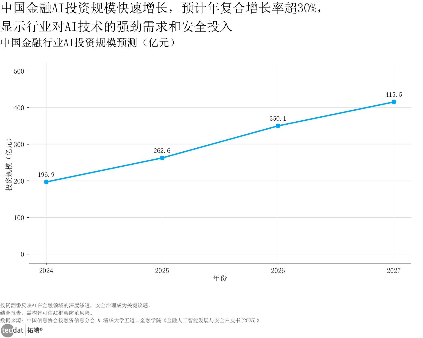 中国金融行业AI投资规模预测折线图表4数据及PDF模板已分享到会员群 3秒解读:2024年投资规模196.94亿元,2027年将达415.48亿元,四年增幅111%,年复合增长率超30%。 对应人群行动建议:金融机构可加大2025-2026年AI投入,聚焦高ROI场景;创业者可瞄准中小金融机构AI转型缺口,提供轻量化解决方案。