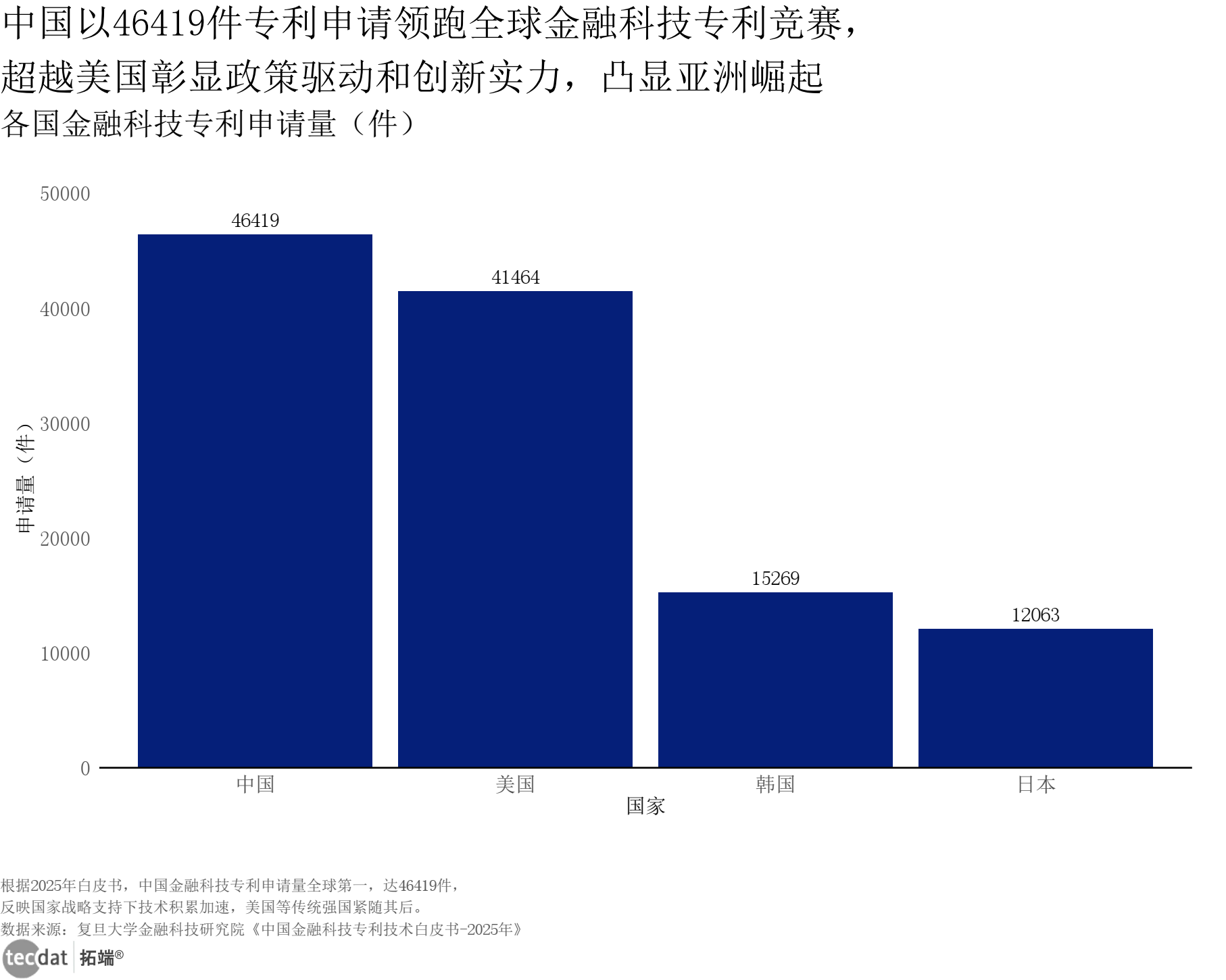各国金融科技专利申请量条形图表6数据及PDF模板已分享到会员群 3秒解读:中国以46419件申请量领跑,美国41464件紧随其后,韩国、日本分别以15269件、12063件位列第三、四位。 对应人群行动建议:跨国企业可加强中美技术合作;国内企业需提升专利质量,加快授权转化。