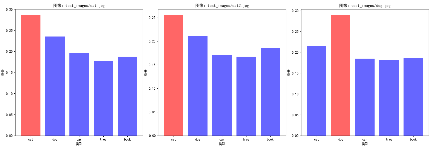 使用设备:cpu 找到3张图像: - test_images/cat.jpg - test_images/cat2.jpg - test_images/dog.jpg 图像:test_images/cat.jpg 分辨率:1200×800 | 比例:3:2 分类结果:cat (置信度:0.2859) 各类别得分: - cat: 0.2859 - dog: 0.2351 - car: 0.1961 - tree: 0.1771 - book: 0.1877 -------------------------------------------------------------------------------- 图像:test_images/cat2.jpg 分辨率:4080×1836 | 比例:20:9 分类结果:cat (置信度:0.2550) 各类别得分: - cat: 0.2550 - dog: 0.2110 - car: 0.1713 - tree: 0.1675 - book: 0.1852 -------------------------------------------------------------------------------- 图像:test_images/dog.jpg 分辨率:2048×1362 | 比例:1024:681 分类结果:dog (置信度:0.2888) 各类别得分: - cat: 0.2145 - dog: 0.2888 - car: 0.1846 - tree: 0.1805 - book: 0.1853 -------------------------------------------------------------------------------- 结果已导出到:clip_classification_results.csv === 统计总结 === 处理图像总数:3 图像比例统计: - 照片 (3:2): 1张 (33.3%) - 其他: 2张 (66.7%) 分类结果统计: - cat: 2张 (66.7%) - dog: 1张 (33.3%)