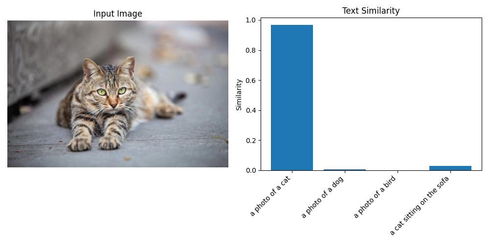 图像与各文本的相似度: a photo of a cat: 0.9666 a photo of a dog: 0.0048 a photo of a bird: 0.0005 a cat sitting on the sofa: 0.0281