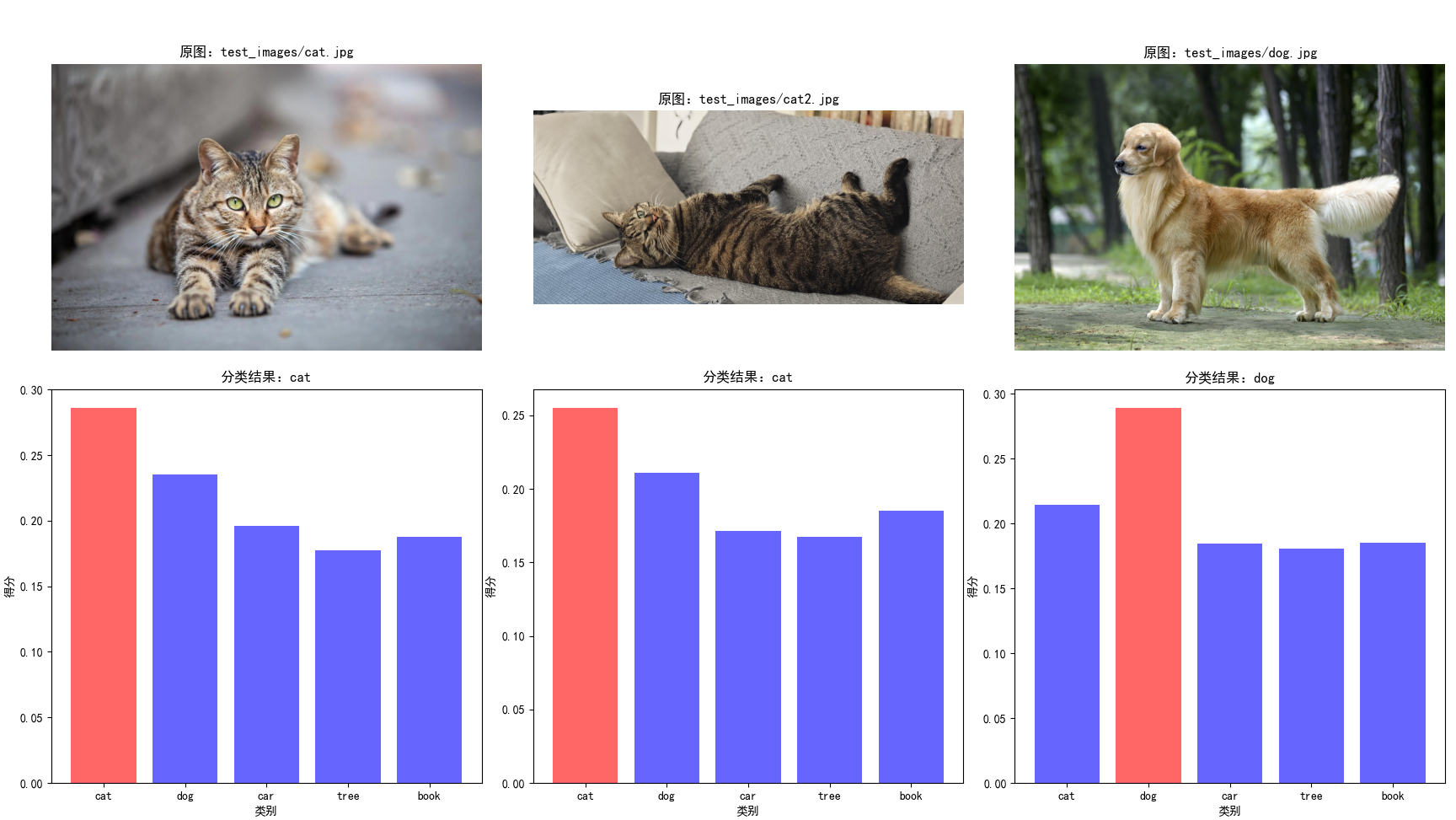 以下示例实现 “基于 CLIP 的零样本图像分类”,支持自定义分类类别,图片以上个示例中的图片为主,统一放置在test_images目录下,会根据 ["cat", "dog", "car", "tree", "book"] 这几个类别判断,每张图片属于每个属性的概览是多少,匹配最符合的那个类型。