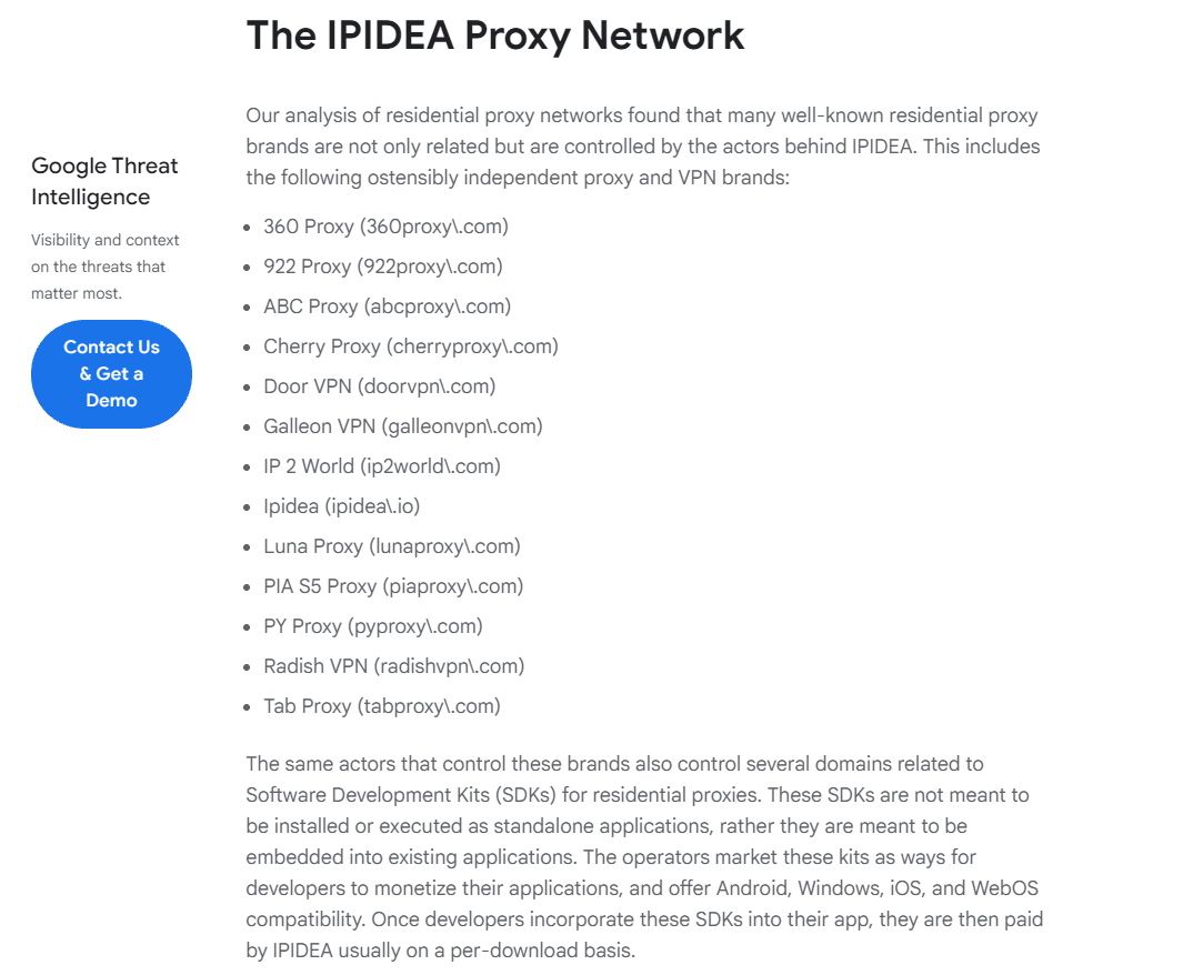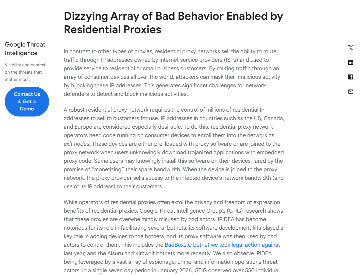 Google 在威胁情报报告中对相关网络采取干扰和处置行动,本质上并不是针对某个具体品牌,而是清楚地传递了一个信号:当 IP 来源授权不清、链路层级过深、用途缺乏治理时,整个代理网络会被直接视为高风险基础设施处理。对于需要长期跑生产、需要经得起审计和复盘的项目来说,这类风险并不是“概率事件”,而是一旦命中就直接清零的结构性风险。