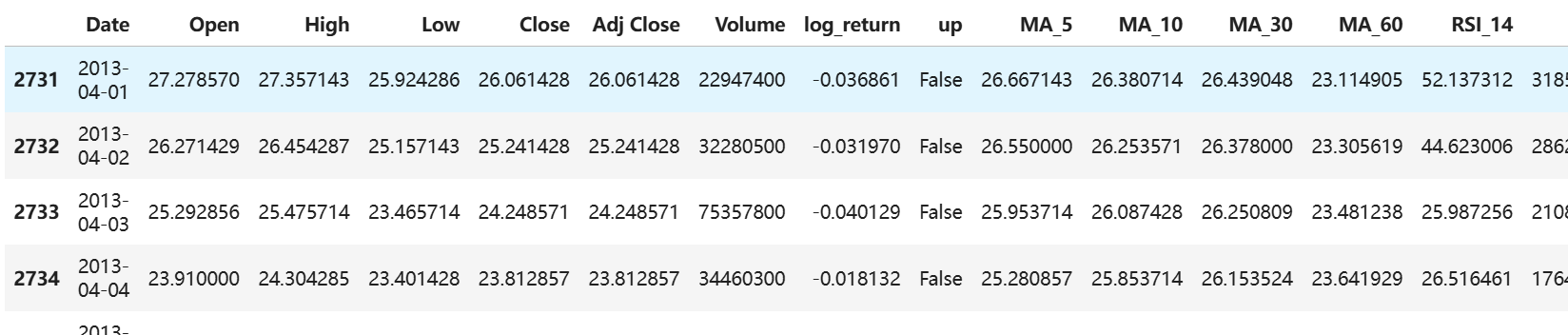 def calculate_tech_indicators(input_df): # 复制数据,避免改乱原始数据(实操必做!) df = input_df.copy()下图能看到,MA_5、RSI_14、OBV等指标都成功加进去了,特征维度一下丰富了!