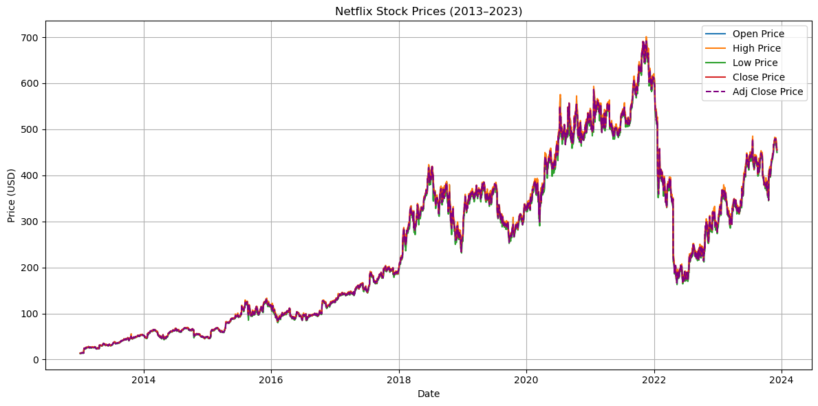 从图里能看明白:2013-2021年Netflix股价一路涨,2021年到峰值后开始落;而且调整后收盘价(紫色虚线)和收盘价几乎重合——说明这10年没拆股等大动作,数据稳定性超棒,不用额外处理!