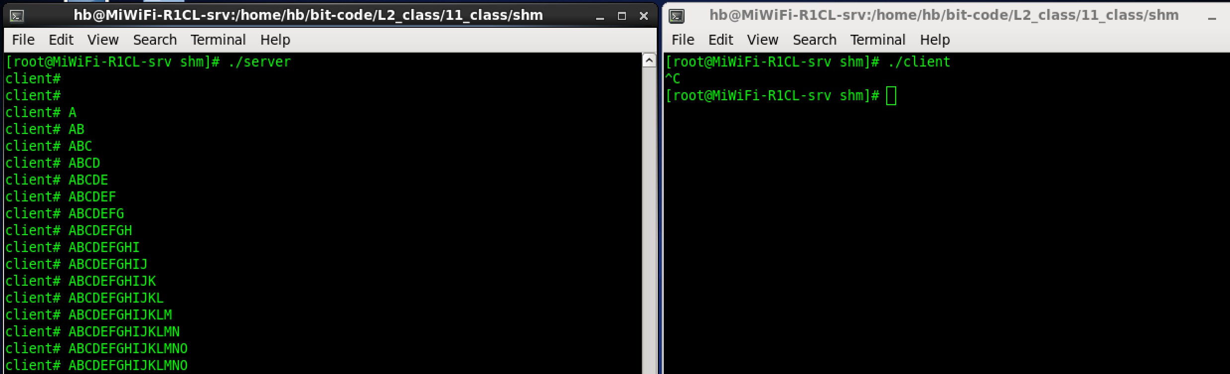 make先启动服务端:打开一个终端,执行./server,服务端创建并映射共享内存,开始循环读取: