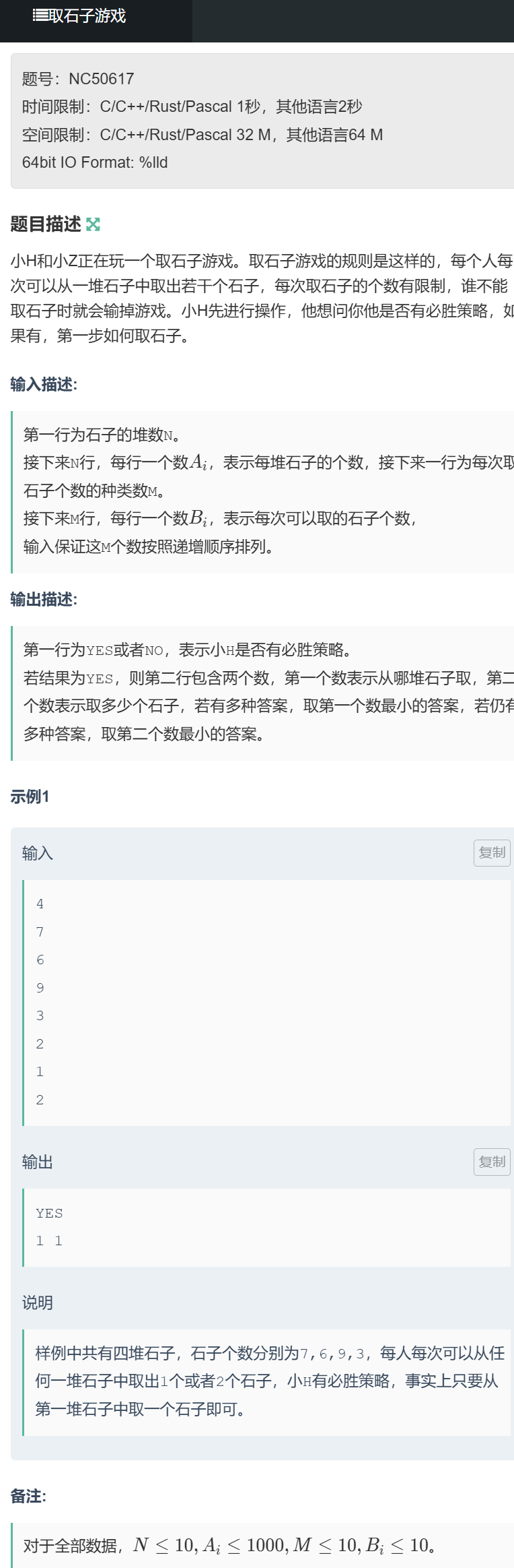 YES表示先手必胜,NO表示必败;YES,第二行输出两个整数,表示从第几堆取、取多少个(字典序最小)。这是取石子游戏的 SG 函数经典应用,核心是动态生成后继状态,而非提前建图: