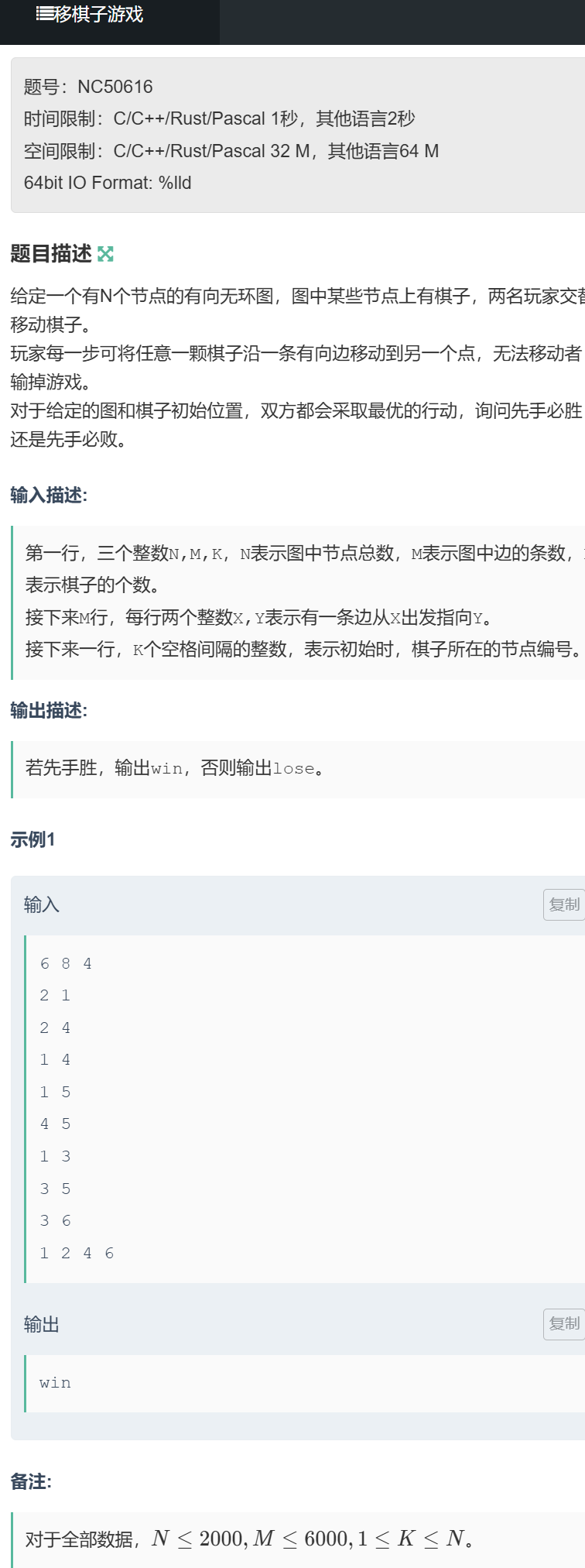 给定一个有 N 个节点的有向无环图,M 条有向边,K 颗棋子分别放在 K 个节点上;两名玩家交替移动棋子,每次可将任意一颗棋子沿一条有向边移动到另一个节点;无法移动棋子的玩家输掉游戏。双方均采取最优策略,问先手是否必胜?
