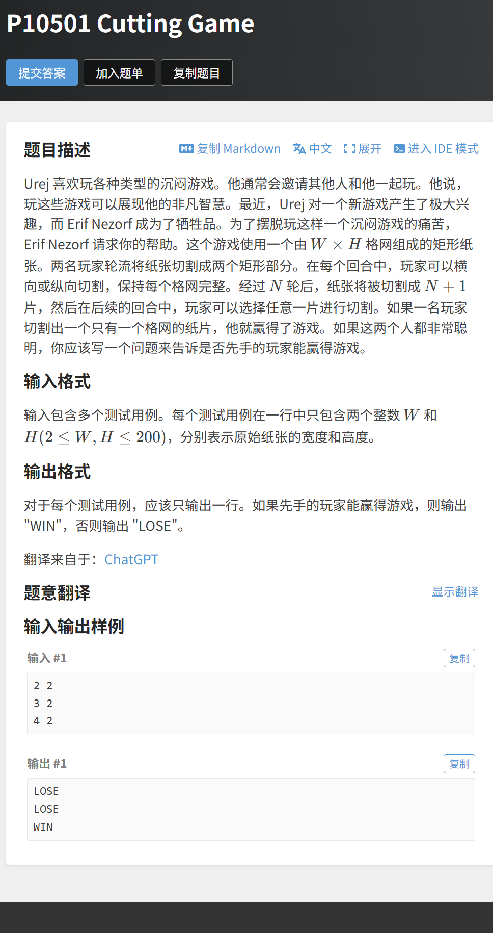 每组用例输出WIN(先手必胜)或LOSE(先手必败)。