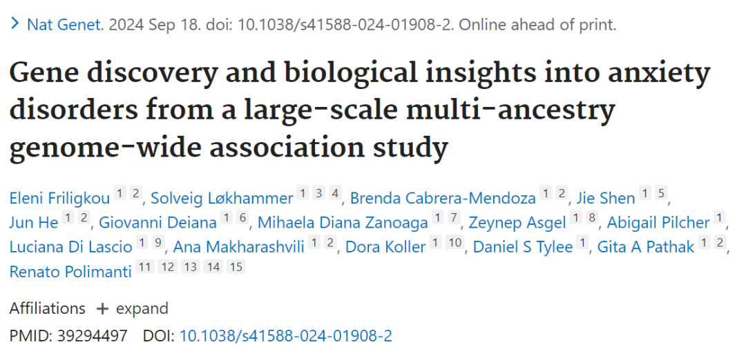 Strom, Nora I., et al. “Genome-Wide Association Study of Major Anxiety Disorders in 122,341 European-Ancestry Cases Identifies 58 Loci and Highlights GABAergic Signaling.” Nature Genetics, Feb. 2026, pp. 1–14. www.nature.com, https://doi.org/10.1038/s41588-025-02485-8