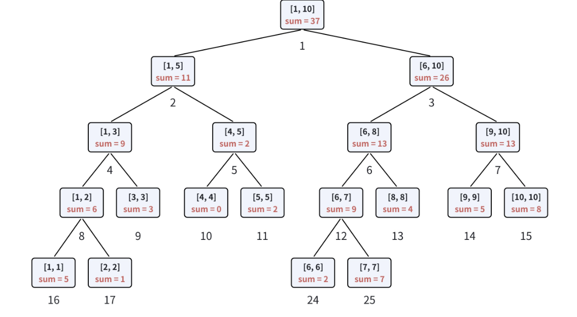 以数组a=[5,1,3,0,2,2,7,4,5,8](下标 1~10)为例,我们构建一个维护区间和的线段树,结构如下: