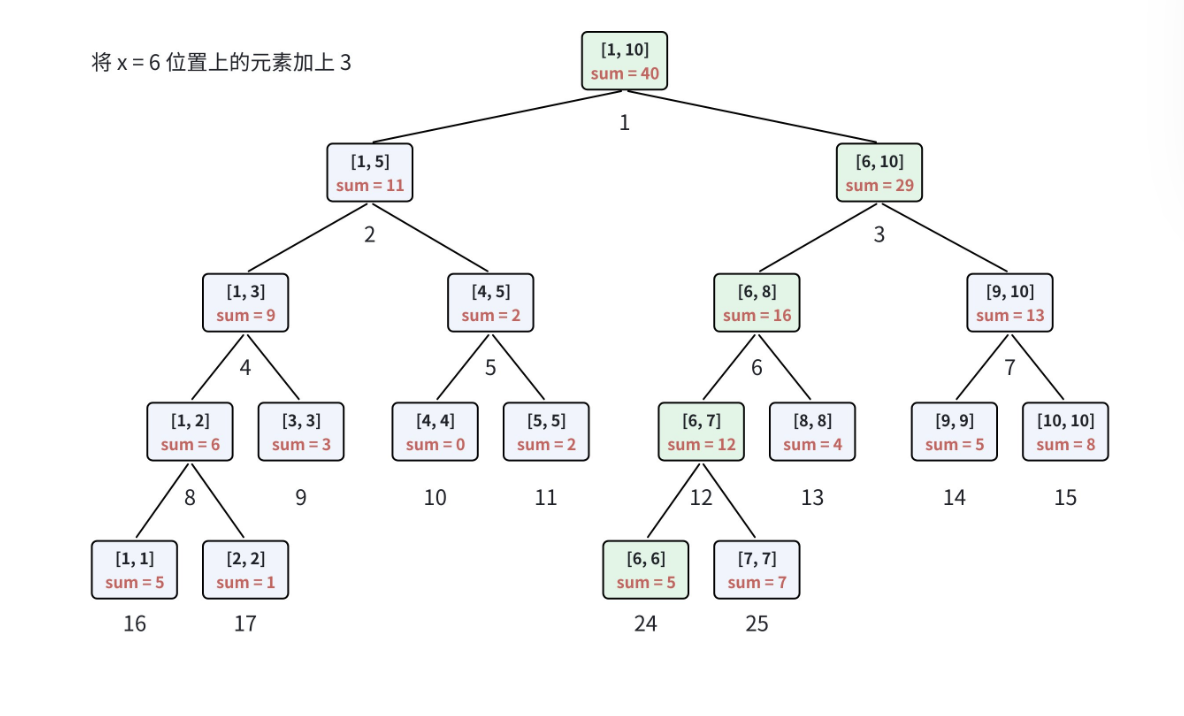 假设要修改原始数组中位置pos的数值,增加k(如果是替换为某个值,可以先计算差值,再执行增加操作),递归修改的规则如下: