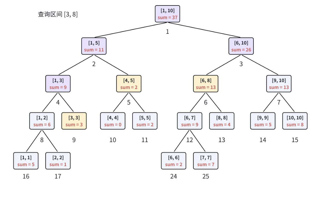 还是以数组a=[5,1,3,0,2,2,7,4,5,8]的线段树为例,查询[3,8]的和: