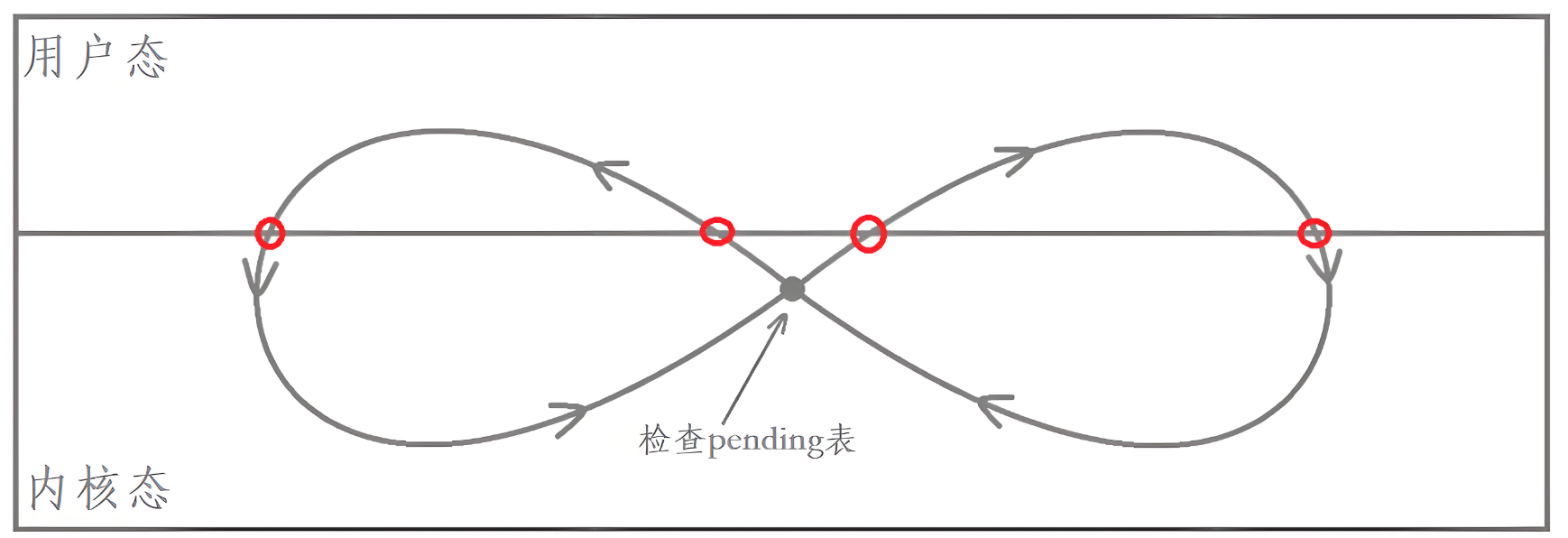 用户写的处理函数位于用户空间,而信号的检测、调度发生在内核空间。操作系统为了保证安全,严格划分了 “内核态” 和 “用户态”: