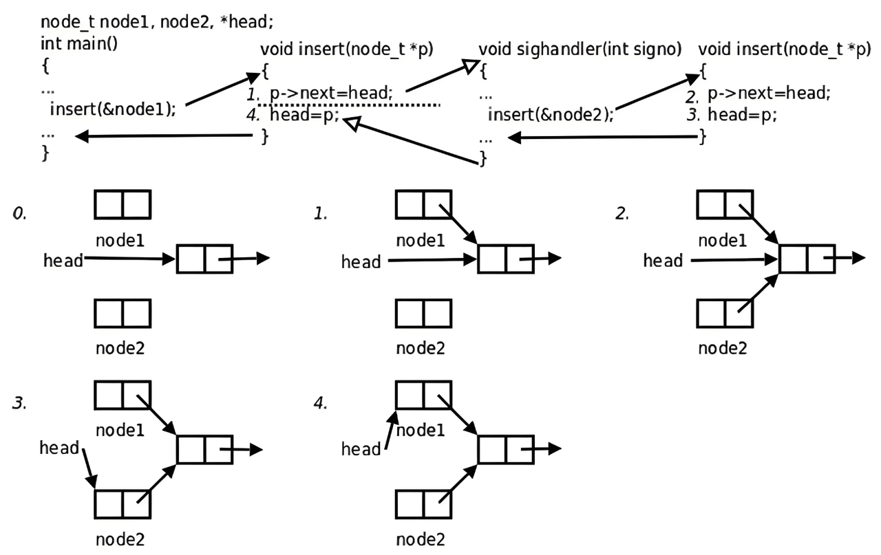 主程序调用insert函数向全局链表插入节点node1,执行到一半时,被信号处理函数打断;信号处理函数也调用insert函数向同一个全局链表插入节点node2,执行完成后切回主程序;主程序继续执行insert的剩余逻辑,最终导致链表数据错乱。