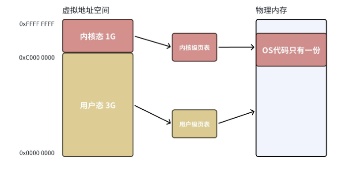 32 位 Linux 系统的虚拟地址空间大小为4GB,内核将其划分为两部分,所有进程共享相同的内核空间,拥有独立的用户空间: