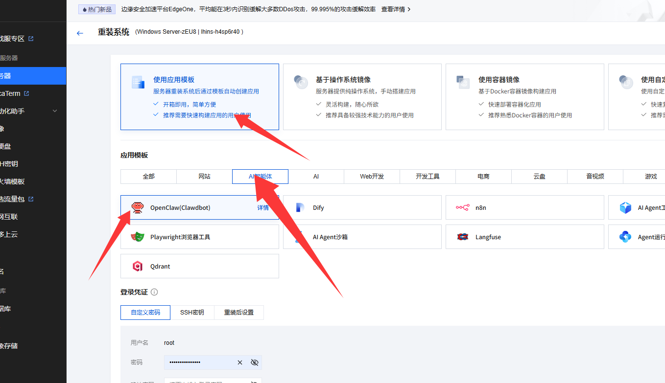 2. 重装方式选择使用应用模板 > AI 智能体 > OpenClaw (Clawdbot),登录凭证选择重装后设置,备份选项建议勾选备份后重装,后续可通过快照恢复原有服务器状态;