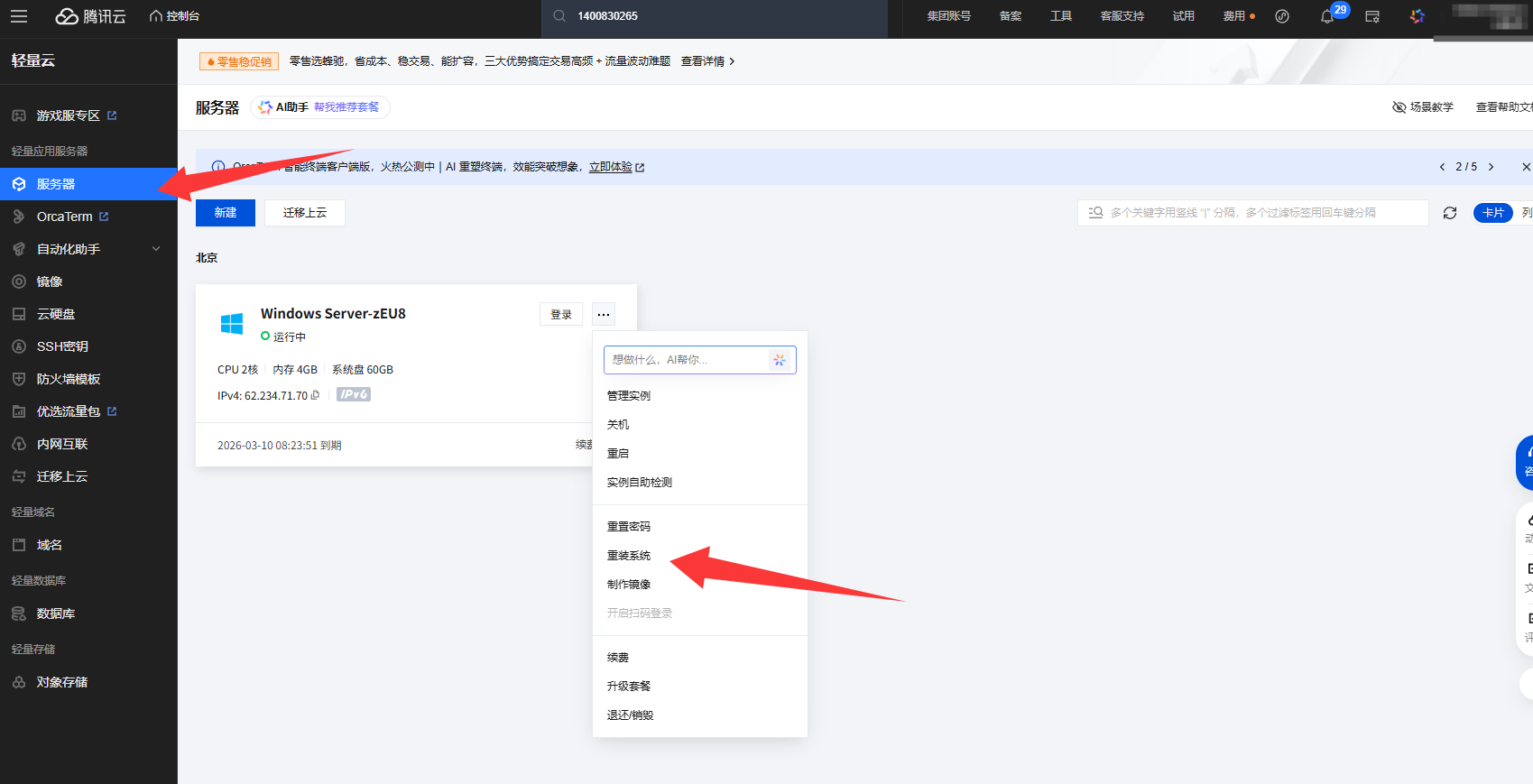 1. 进入腾讯云 Lighthouse 控制台,找到需要重装的存量实例,点击更多 > 重装系统;