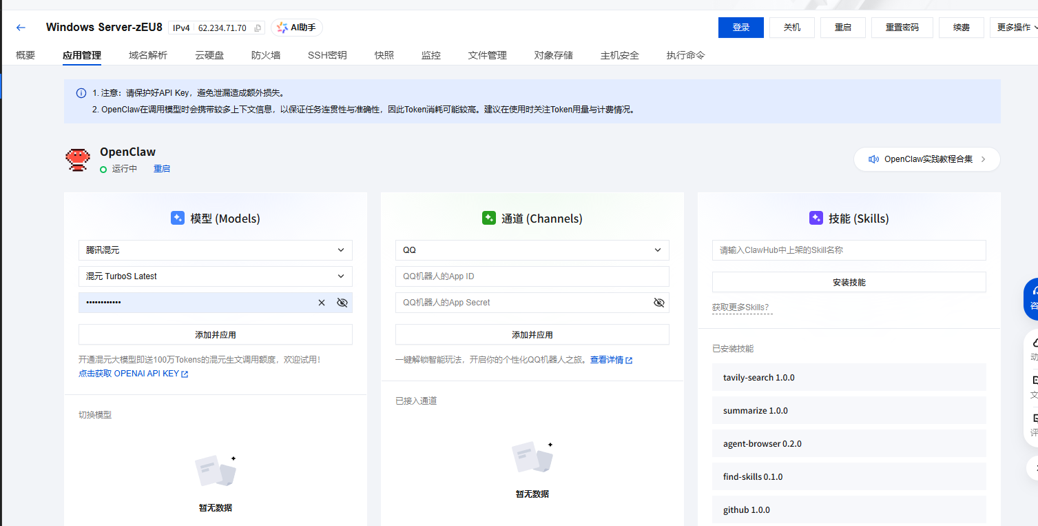完成基础的模型和通道配置后,我们可以登录服务器,操作OpenClaw,同时进行一些其他配置。