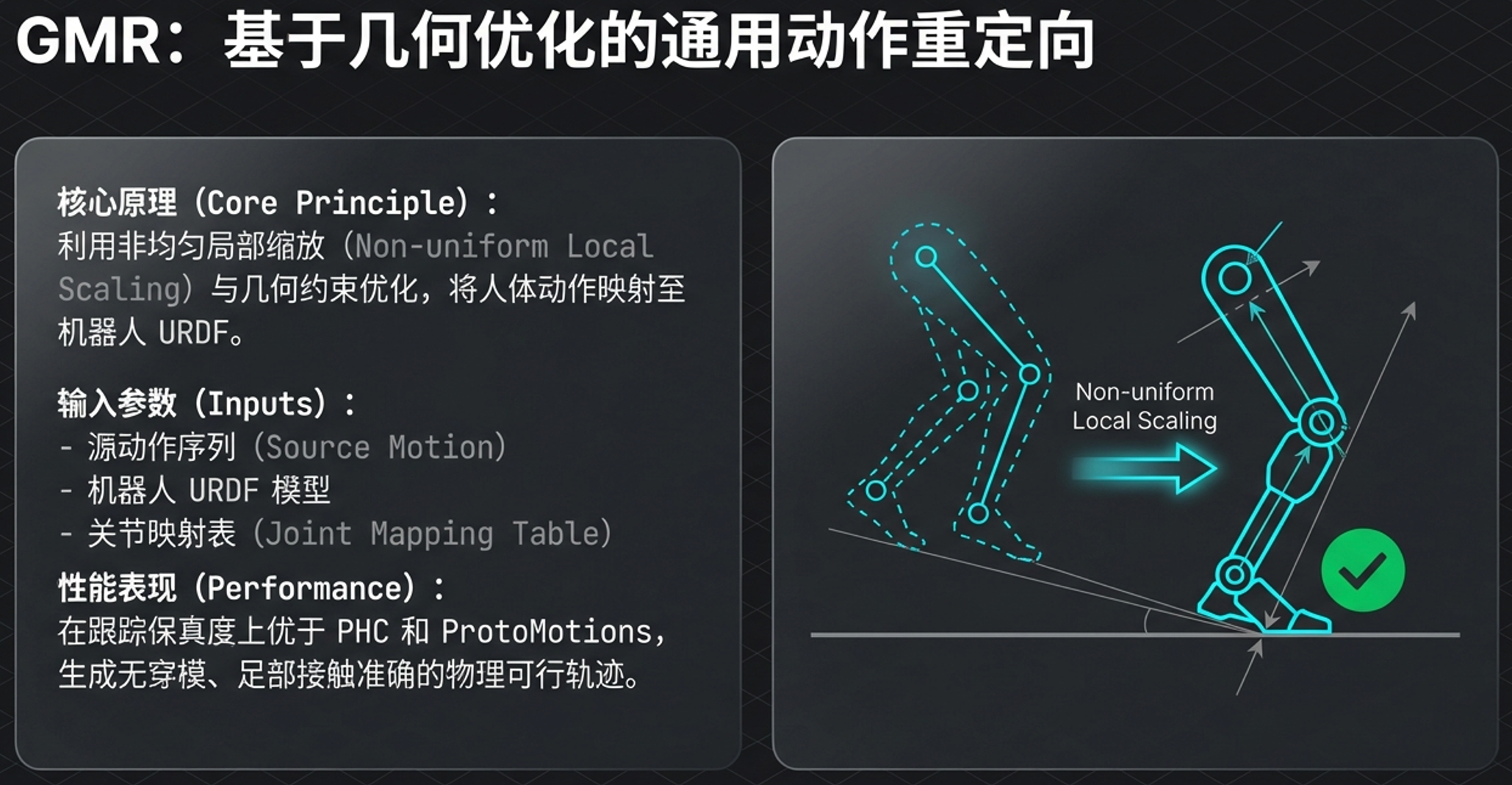 - 输出:重定向后的机器人关节轨迹序列(位置、速度),可直接用于仿真中的跟踪目标。