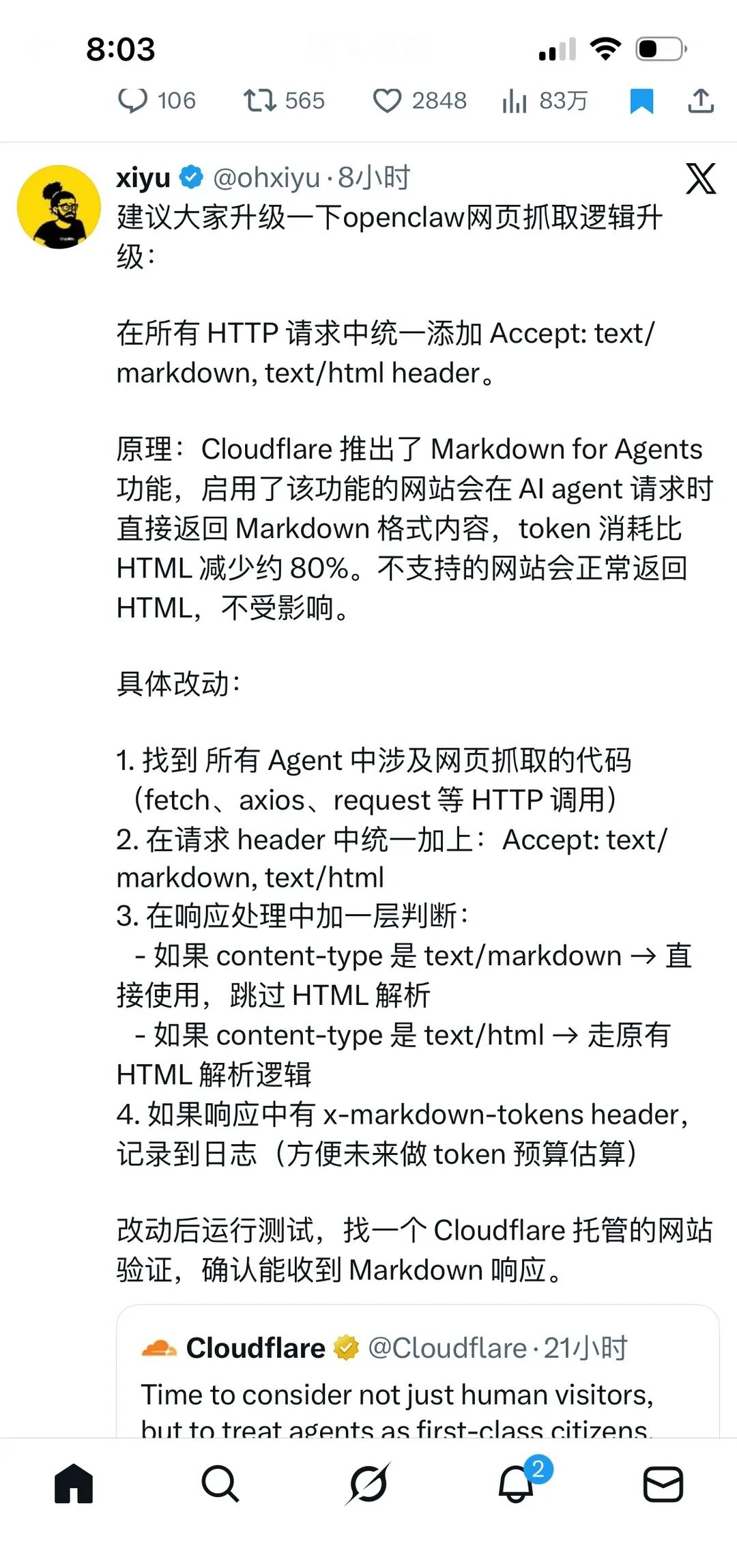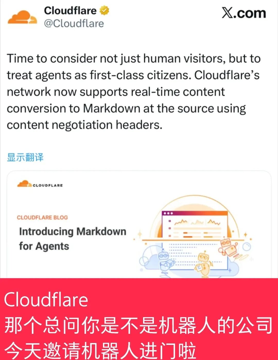 一、全球最大的网络基础设施服务商 Cloudflare 官宣:Markdown for Agents。