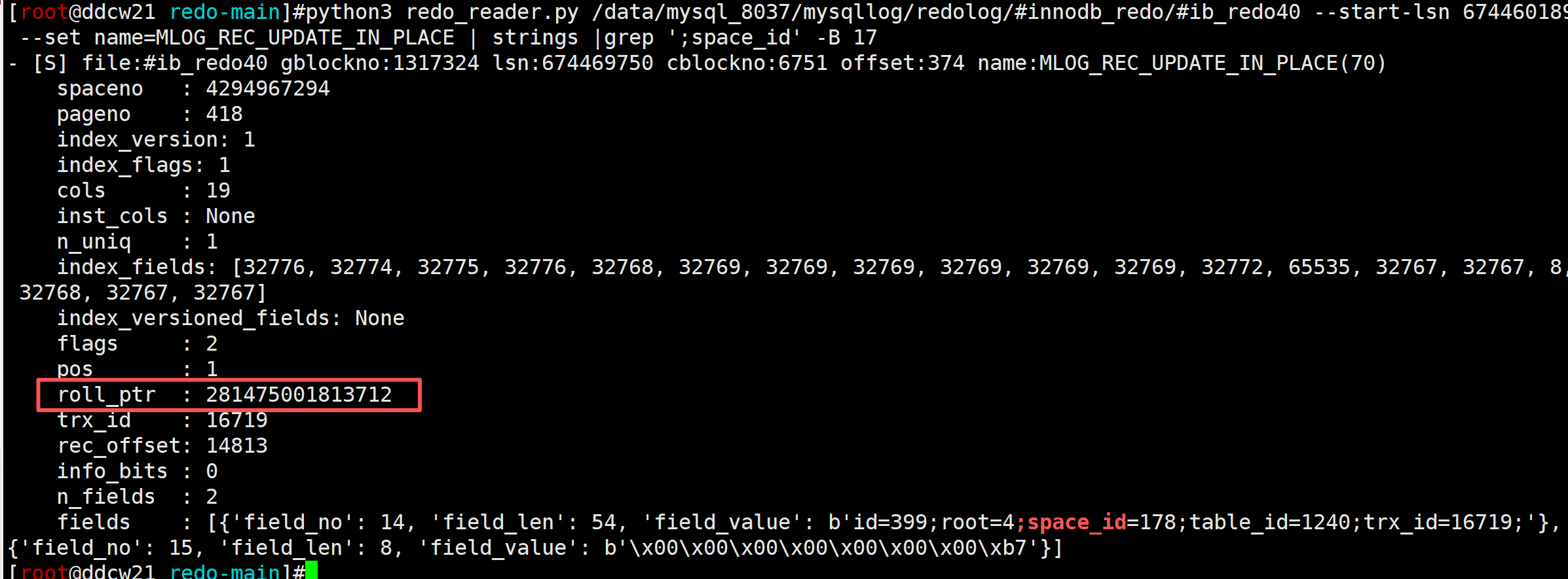 python3 redo_reader.py /data/mysql_8037/mysqllog/redolog/#innodb_redo/#ib_redo40 --start-lsn 674460189 --set name=MLOG_REC_UPDATE_IN_PLACE | strings |grep ';space_id' -B 17