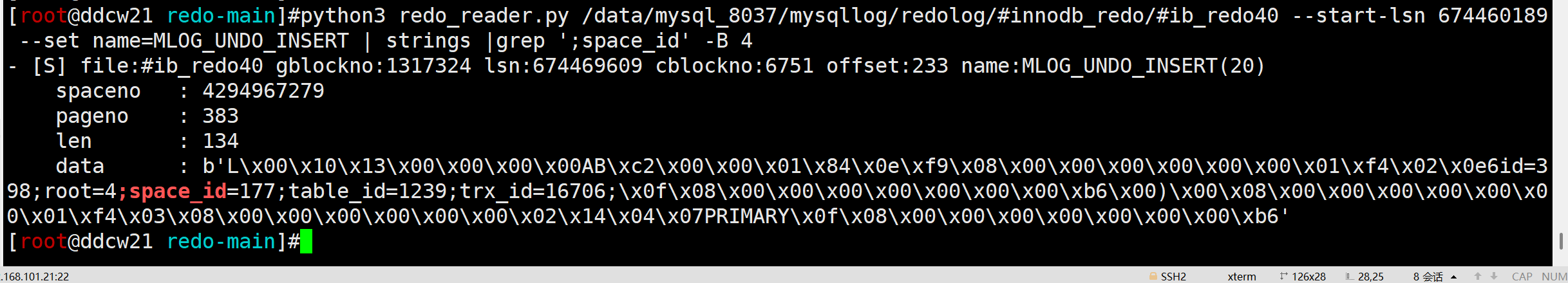 python3 redo_reader.py /data/mysql_8037/mysqllog/redolog/#innodb_redo/#ib_redo40 --start-lsn 674460189 --set name=MLOG_UNDO_INSERT | strings |grep ';space_id'