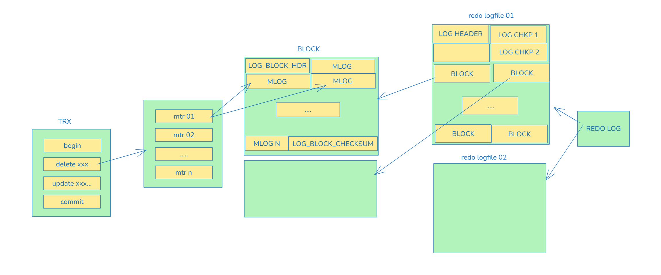 一个事务由若干条SQL组成, 一条SQL由若干个mtr(mini-transaction)组成, 一个mtr由若干个mlog组成. 若干个mlog放在若干个block里面. 若干个block组成一个redo log file, 若干个redo log file构成redo(group).