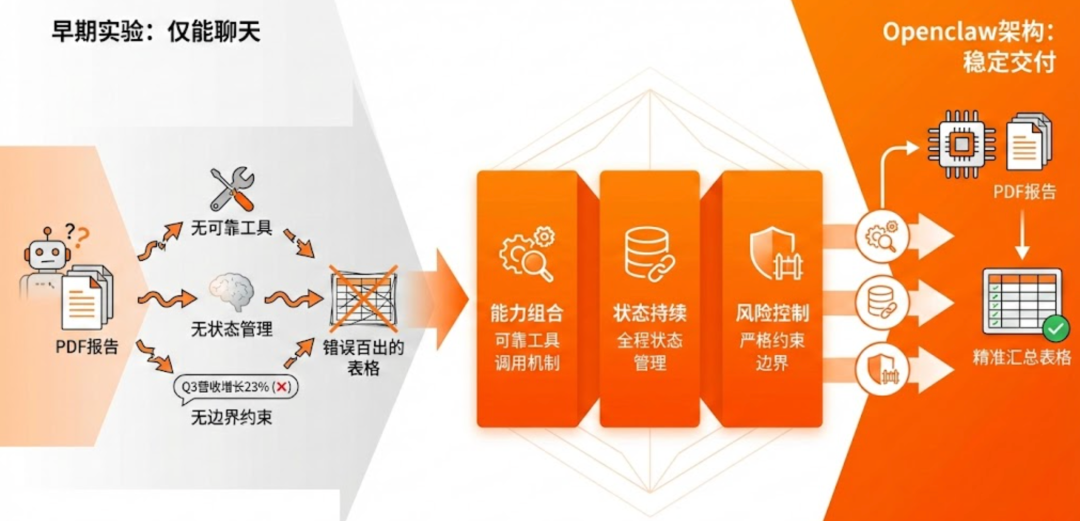 第一,没有可靠的工具调用机制,Agent 不知道怎么真正去读文件;第二,没有状态管理,做到第三步就忘了前两步要干什么;第三,没有约束边界,它觉得"编一个合理数字"也算完成任务。
