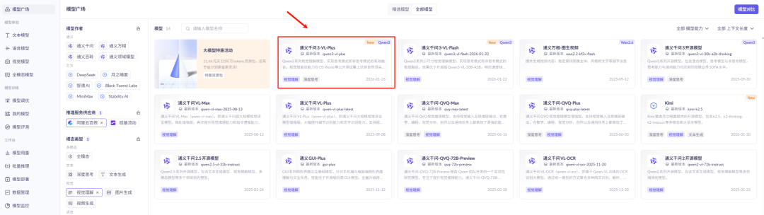 在阿里云百炼模型广场中,可以查看到所有支持的模型