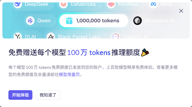 3、开通之后,新用户每个模型都会赚送100w的免费体验额度