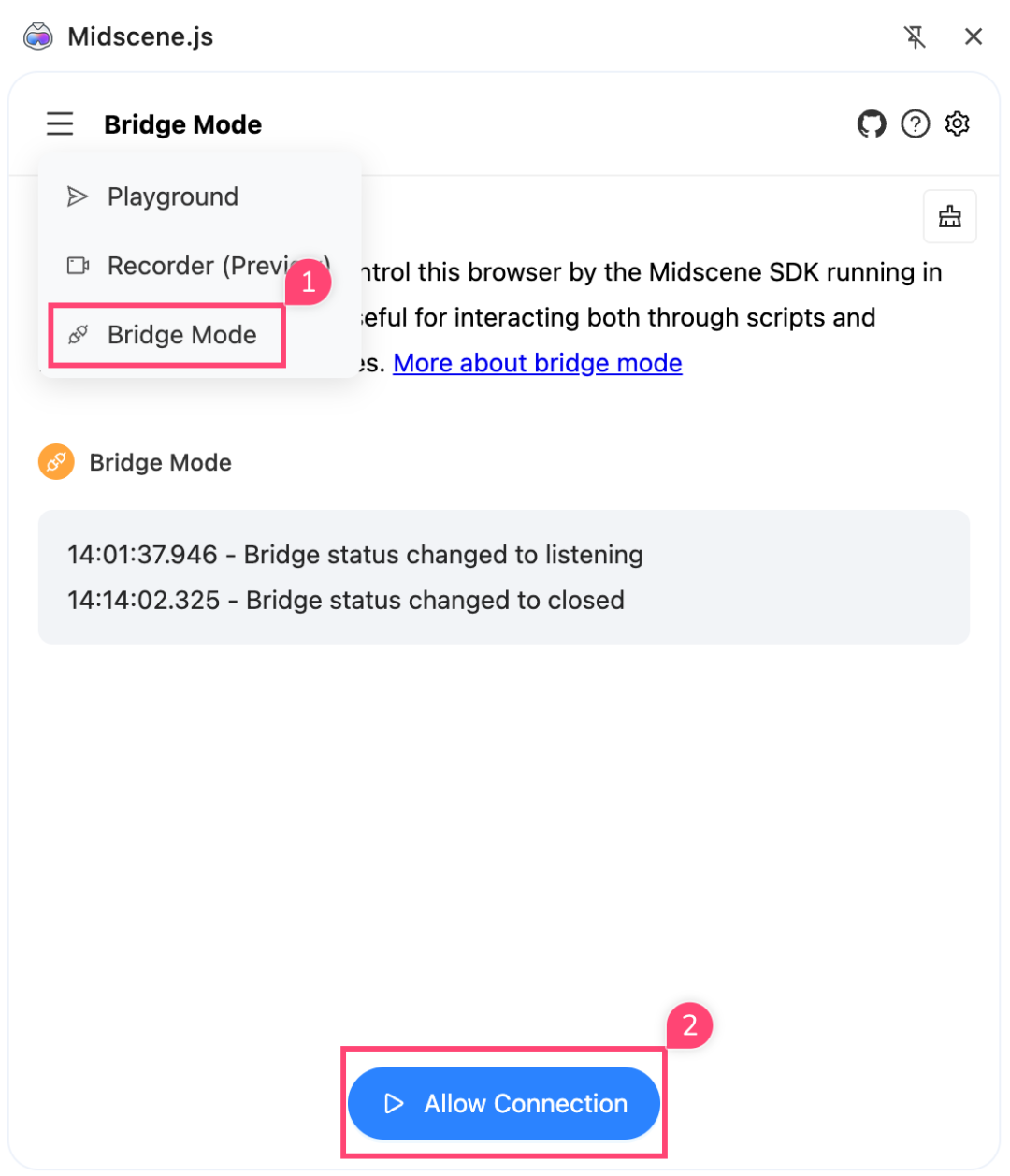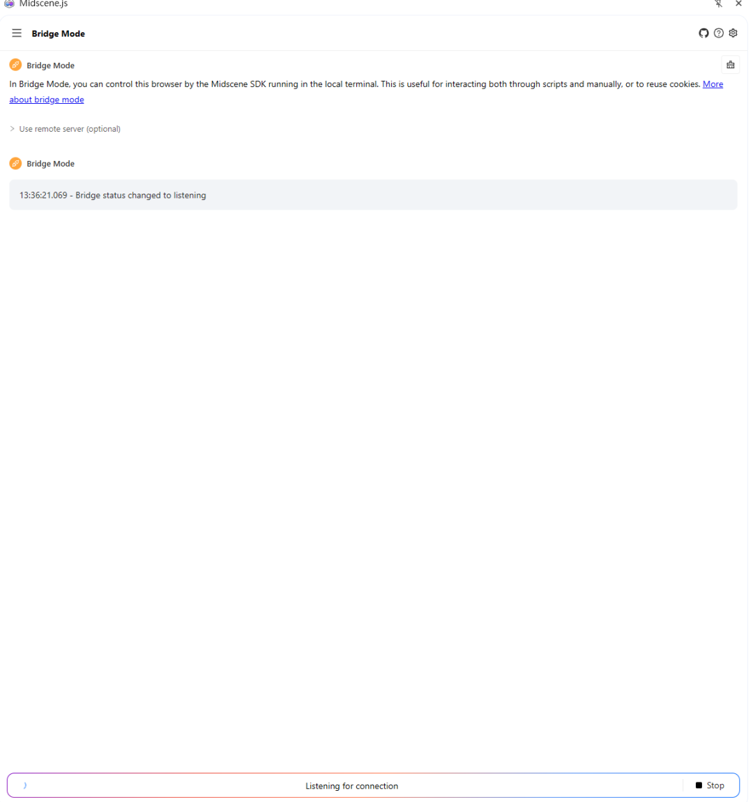 3、除了这种常规用法,Midscene还支持桥接模式连接,Midscene Chrome 插件的桥接模式允许你使用本地脚本来控制桌面版 Chrome。脚本既能连接新标签页,也可以附着到当前激活的标签页。这种方式能复用本地浏览器的 cookies、插件和页面状态,与自动化脚本协作完成任务;在自动化领域也被称作 “man-in-the-loop”。