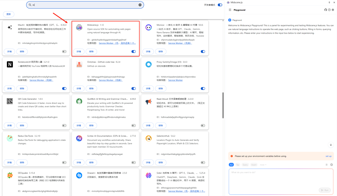 插件安装完成后,启动扩展(可能默认折叠在 Chrome 扩展列表中),你应该能在浏览器右侧看到名为 “Midscene” 的侧边栏。