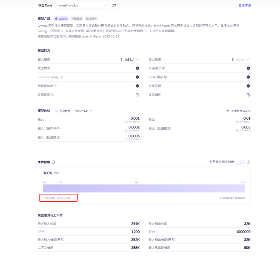 比如我们要选用的qwen3-vl-plus,这个是通义千问推出来的新版视觉理解模型,如果你不清楚,你能不能用这个模型,可以点击进入看一下还有没有免费额度