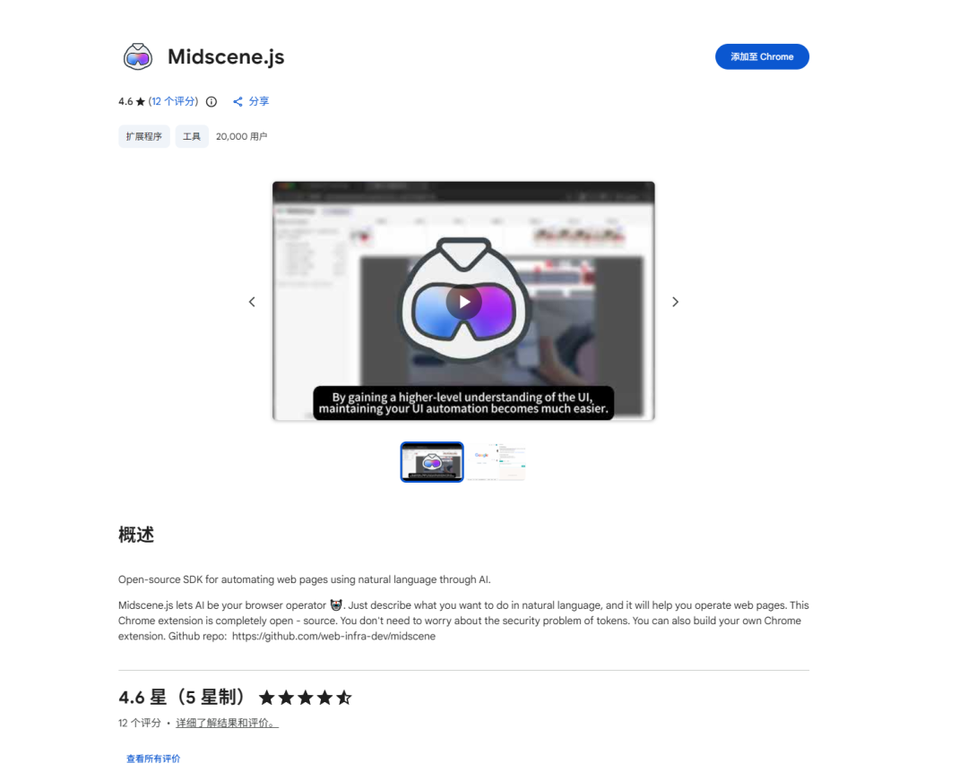 如果想通过 Midscene.js Chrome 插件快速体验AI测试的话,我们需要先前往 Chrome 扩展商店安装 Midscene 扩展