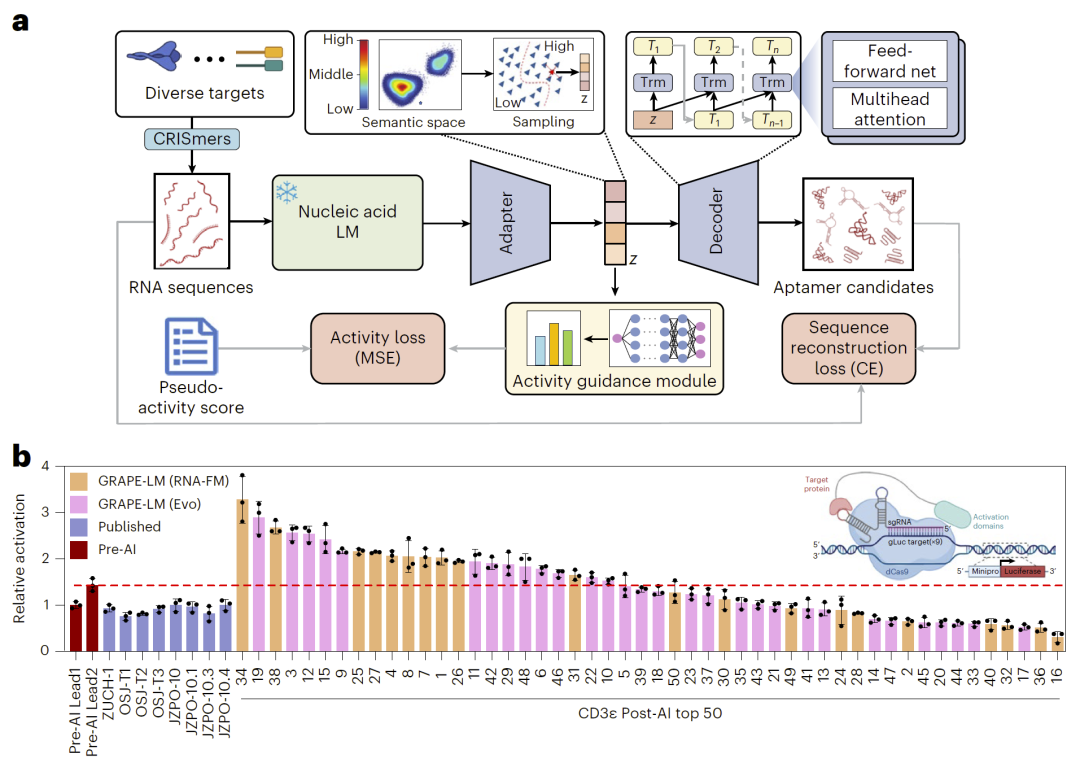RNA 适配体(RNA aptamer)因其高特异性结合能力,在靶向治疗、分子诊断和生物传感等领域具有重要应用潜力。然而,适配体的发现与优化长期以来依赖多轮、劳动密集型的体外筛选流程,效率低、成本高,且往往难以保证在真实细胞环境中的功能稳定性。近日,研究人员提出了一种名为 GRAPE-LM(Generator of RNA Aptamers powered by activity-guided Evolution and Language Model)的生成式人工智能框架,首次实现了 RNA 适配体的一轮进化(one-round evolution),为这一领域带来了颠覆性的技术路径。