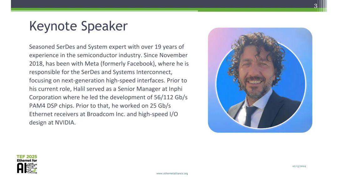 本文内容基于以太网联盟2025年TEF(Ethernet for AI)大会上,Meta AI架构师Halil Cirit的主题演讲《Transitioning to 400G SerDes: Key Drivers and System Design Implications for Future AI Workloads》整理,演讲者Halil Cirit是拥有超过19年半导体行业经验的资深SerDes与系统专家,自2018年11月加入Meta(原Facebook)以来,负责SerDes与系统互连技术规划,核心聚焦下一代高速接口的研发与落地。加入Meta前,Halil Cirit曾担任Inphi公司高级经理,主导56/112 Gb/s PAM4 DSP芯片的开发;更早还曾任职于博通公司,负责25 Gb/s以太网接收机研发,以及英伟达的高速I/O设计工作,具备全链路高速互连技术的深厚积累。