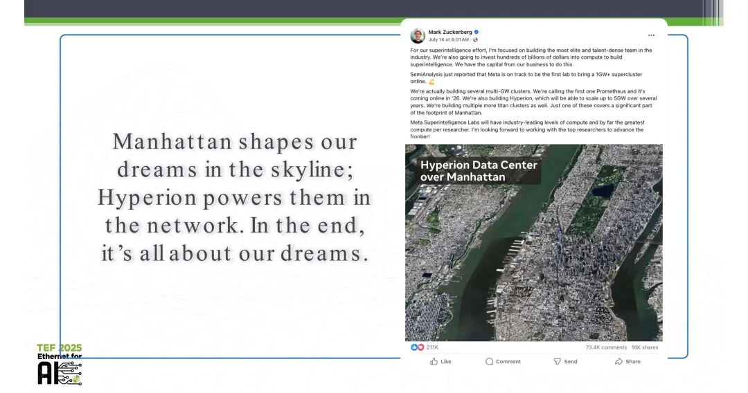 在此背景下,Meta正在推进超大规模AI集群的阶梯式扩张:2023年已实现24K GPU规模的数据中心级集群部署;2024年集群规模扩展至129K GPU,实现区域级覆盖;2025年及未来,将进一步迈向数百万GPU规模的多区域级集群。更具标志性的是,Meta正在开发名为Prometheus的超算集群,预计2026年将实现1GW+的算力规模上线;其长期规划的Hyperion集群,未来几年将逐步扩展至5GW的算力规模,同时Meta还在同步建设多个超大规模集群,单集群的占地面积已接近曼哈顿的核心区域规模。