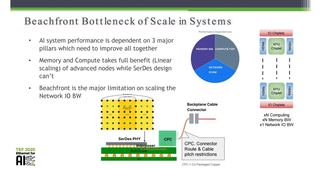 AI系统的性能释放,依赖于内存带宽、计算能力、网络IO带宽三大支柱的协同提升,三者必须同步迭代才能实现系统性能的线性扩展。但当前行业面临的核心矛盾在于,内存与计算能力可随着半导体制程的先进节点升级实现线性缩放,而SerDes设计无法同步跟进这一节奏,网络IO带宽成为制约AI集群规模扩展的核心瓶颈,也就是行业所称的Beachfront瓶颈。