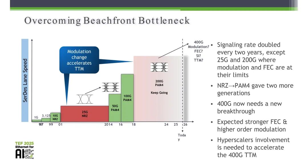 为破解Beachfront瓶颈,提升单链路的传输速率成为唯一可行的路径,行业向400G SerDes的技术转型已成为必然趋势。回顾高速SerDes的演进历程,其信令速率原本保持每两年翻倍的节奏,从早期的1G、3.125G,到10G、25G的NRZ调制,再到50G、100G、200G的PAM4调制,其中NRZ向PAM4的调制技术升级,支撑了两代速率的提升。但当前200G PAM4已触及调制技术与前向纠错(FEC)的性能极限,400G SerDes的规模化落地,需要全新的技术突破,包括更强的FEC机制与更高阶的调制方案,同时需要超大规模云厂商的深度参与,加速产品的上市时间(TTM)。