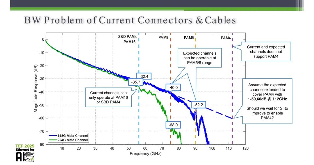 信道性能的不足,是400G SerDes落地面临的核心物理层挑战。Meta的信道测试数据显示,224G Meta信道在56GHz频率下的插入损耗为-35.7dB,448G Meta信道的插入损耗是-32.4dB,支持工作在PAM16或SBD PAM4模式;即使是未来优化后的信道,也仅能支持PAM6/PAM8的调制范围(-40 dB@75GHz,-52.2 dB@90GHz),无法满足PAM4的损耗要求。这一现状意味着,行业无法等待信道性能的改善来适配PAM4调制,必须通过调制技术、FEC算法的底层革新,来实现400G SerDes的工程化落地。