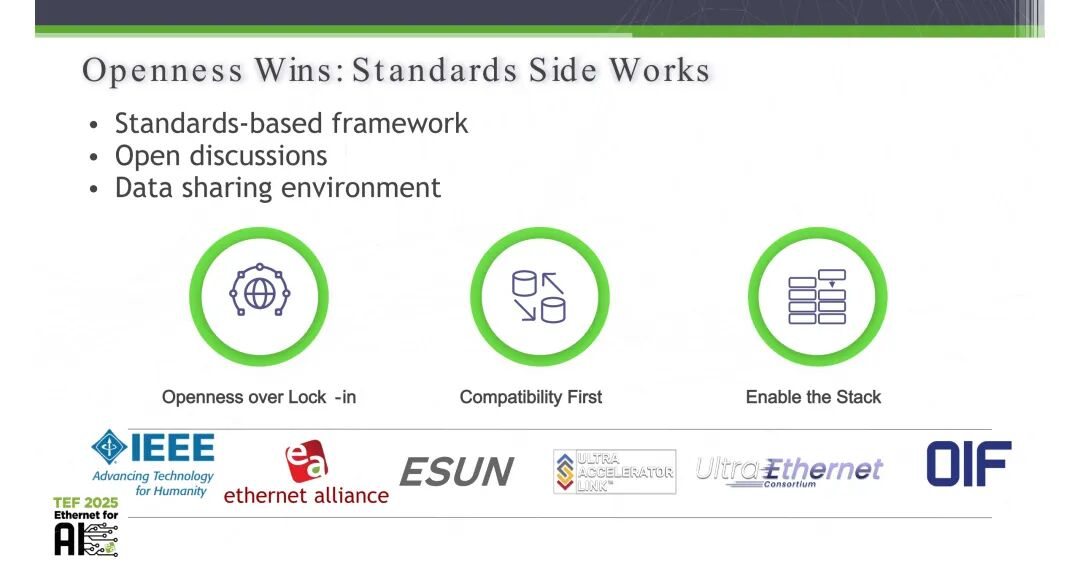 同时,开放的标准框架与生态建设,是技术快速迭代的核心基础。以太网联盟始终坚持基于标准的技术推进框架,通过开放的技术讨论、共享的数据环境,促进全行业的信息交流与技术迭代。行业必须坚持开放优于锁定、兼容性优先的原则,依托IEEE、OIF、超以太网联盟等标准组织的协同,构建完整的高速互连技术栈,推动技术的普惠落地。