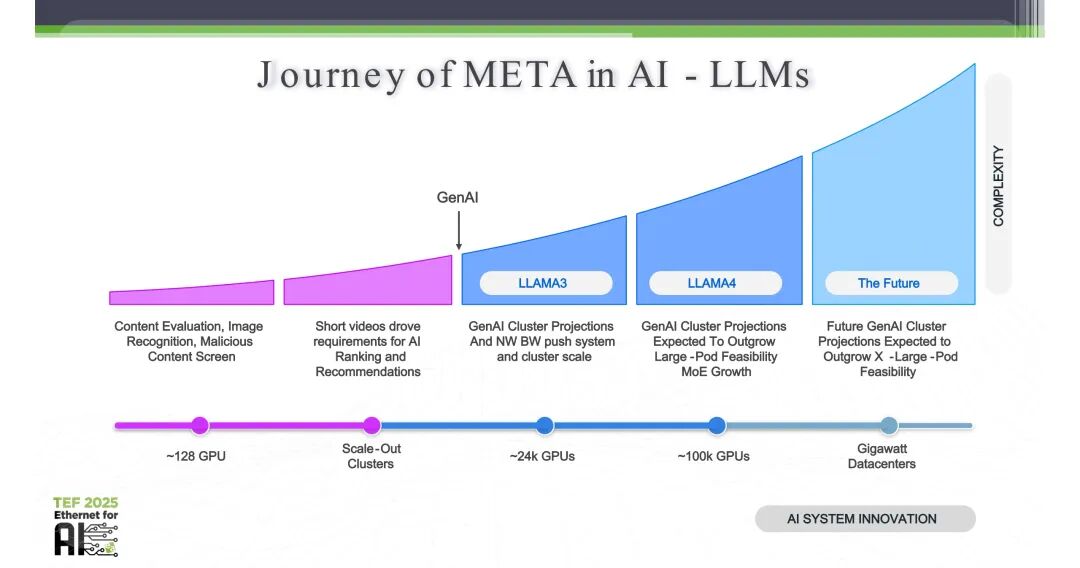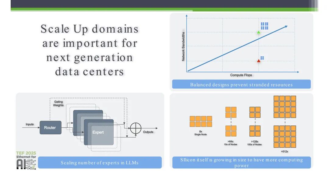 以Llama系列大模型为核心的生成式AI技术迭代,正在重构数据中心集群的规模边界。MoE(混合专家模型)架构的快速发展、大模型专家数量的持续扩张,使得集群网络带宽需求的增速远超单节点算力的提升。同时,单芯片的硅片面积持续扩大以承载更强的算力,更高数量的加速器成为保障AI性能的必需配置。
