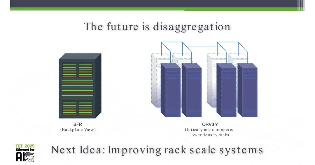但超高密度机架的规模扩张,同步带来了多维度的落地挑战:包括机架设计与制造的难度显著提升、大尺寸机架的运输成本高企、现场运维操作的复杂度大幅增加,同时还需要数据中心基础设施的全面升级适配。基于此,解耦化架构、采用光互连的低密度机架,成为下一代机架系统的核心演进方向。