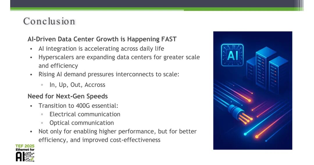 当前,AI技术的全场景渗透正在驱动数据中心规模的爆发式增长,生成式AI的快速迭代与超大规模集群的建设,对互连系统提出了Scale-in、Scale-up、Scale-out、跨域全维度的带宽压力。向400G SerDes的技术转型,是支撑未来AI工作负载的核心路径,其不仅覆盖电互连场景,也将同步支撑光互连的技术演进,最终不仅实现系统性能的跃升,更将优化数据中心的能效水平与成本效益。而这一技术的规模化落地,离不开全产业链的协同创新与开放标准生态的持续建设。