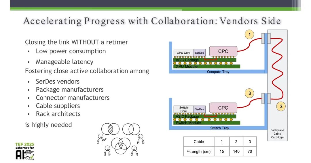 400G SerDes的规模化落地,无法依靠单一环节的技术突破,需要全产业链的深度协同与联动。行业需要推动SerDes厂商、封装制造商、连接器厂商、线缆供应商、机架架构师的紧密合作,核心目标是实现无重定时器(retimer)的端到端链路设计,从而在实现高速传输的同时,降低链路功耗、控制传输延迟,适配AI工作负载的低延迟需求。