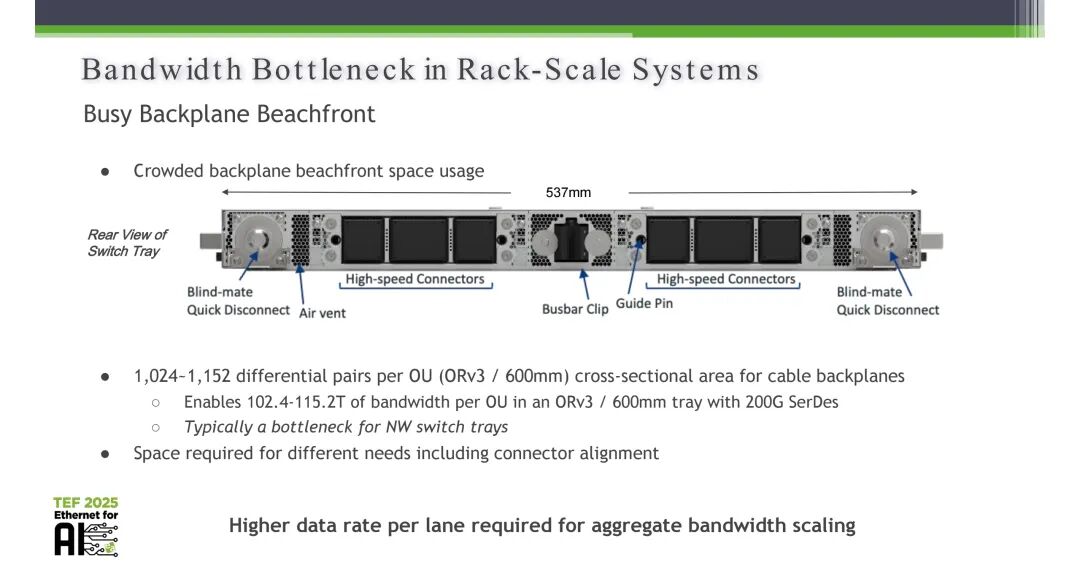 Beachfront瓶颈的核心本质,是背板物理空间对高速互连链路的刚性约束。以ORv3 600mm规格的OU为例,其交换机托盘背板的横截面空间极为紧张,仅能部署1024~1152对差分对,在200G SerDes的配置下,单OU仅能实现102.4T~115.2T的总带宽,这一限制已成为网络交换机托盘的核心性能瓶颈。同时,背板空间还需要预留盲插快速断开结构、通风口、高速连接器、母线夹、导向销等功能结构的安装与对准空间,进一步压缩了高速互连链路的可用部署空间。