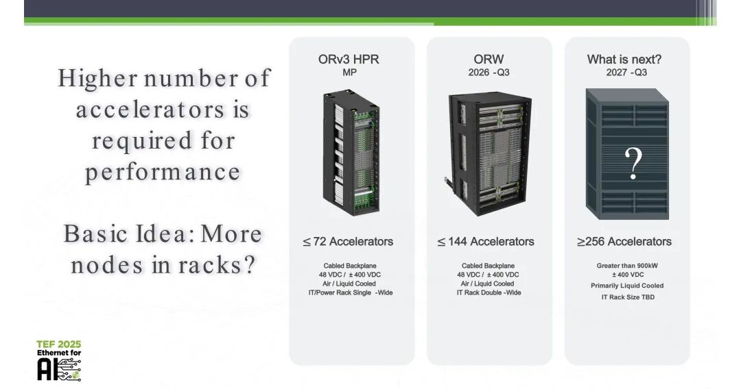 为提升单机架的算力密度,行业正在推进机架架构的持续迭代,当前已形成清晰的演进路径:当前主流的ORv3机架支持单机架不超过72个加速器,采用有线背板设计,支持48 VDC/±400 VDC供电,兼容风冷与液冷方案,为单宽IT/电源机架;下一代机架将支持单机架不超过144个加速器,采用双宽IT机架设计,供电与散热方案保持兼容;未来将推出不少于256个加速器的超高密度机架,单机架功耗突破900kW,采用±400 VDC供电,以液冷为主要散热方案,机架尺寸仍在规划中。
