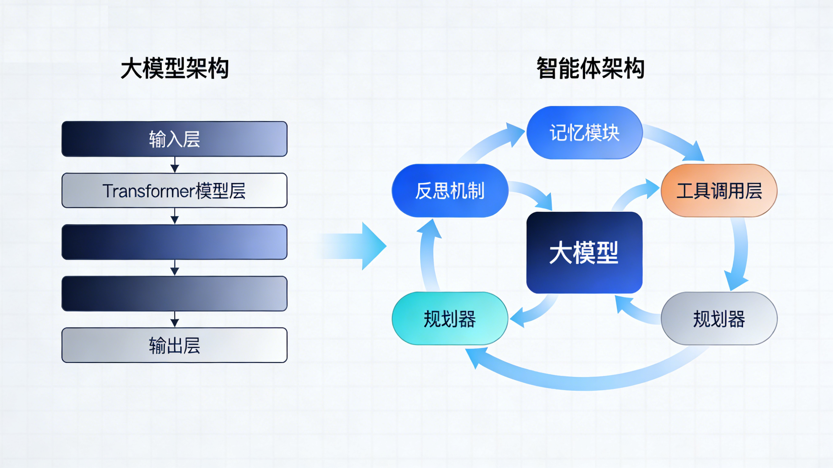 二者应用范式截然不同:大模型是“问答工具”,需用户明确指令;智能体是“任务伙伴”,可自主完成端到端目标,是大模型从能说到会做的关键进化方向。