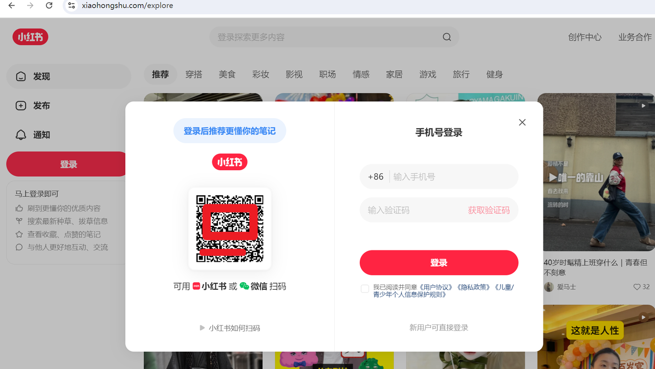 • 程序会自动打开 Chrome 浏览器(或者提示你选择浏览器),用小红书 App 扫码登录。